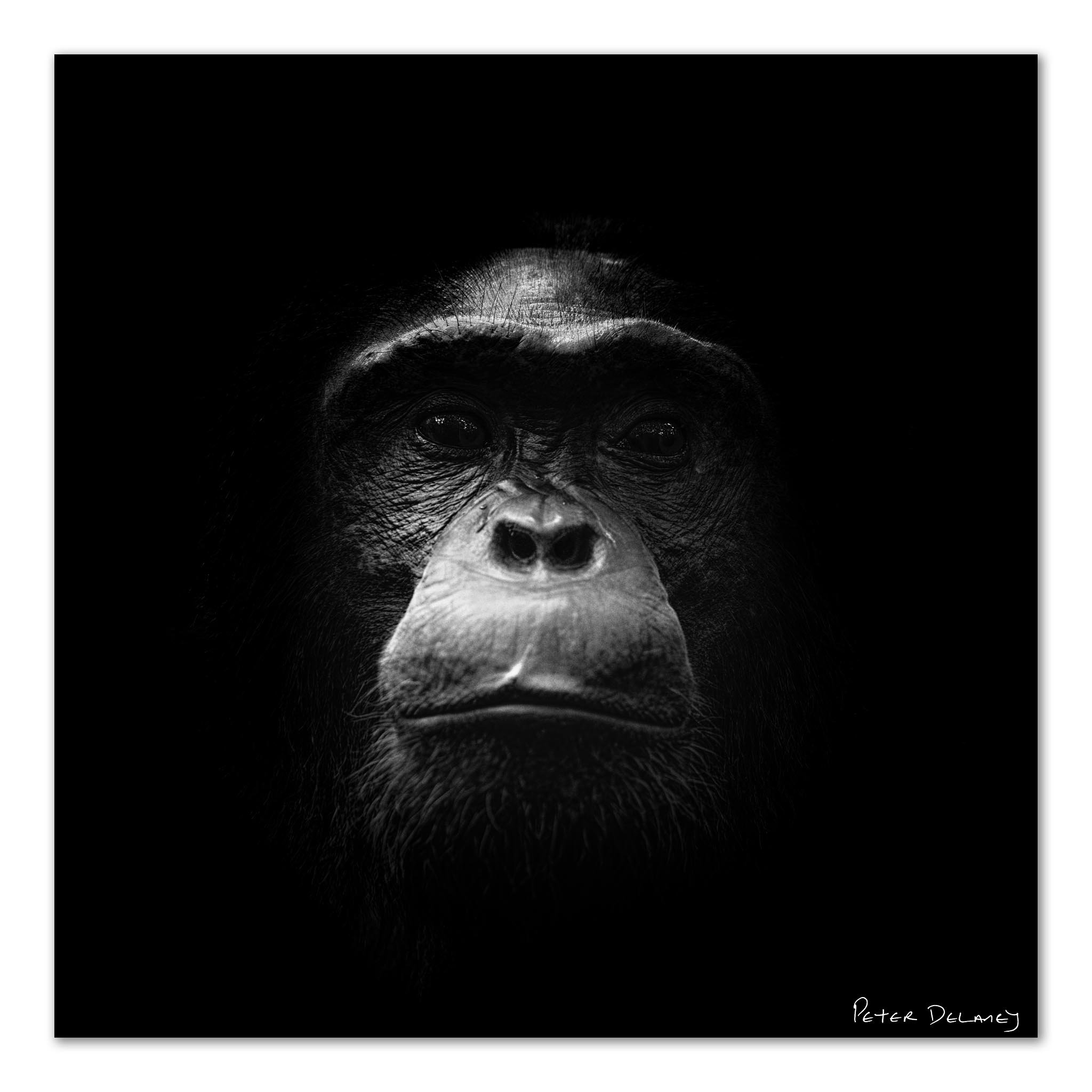 A square portrait isolates the chimpanzee’s face against deep black, stripping away distraction. Every detail of expression, every shadow and highlight, draws you into a direct, unflinching connection with one of our closest relatives.